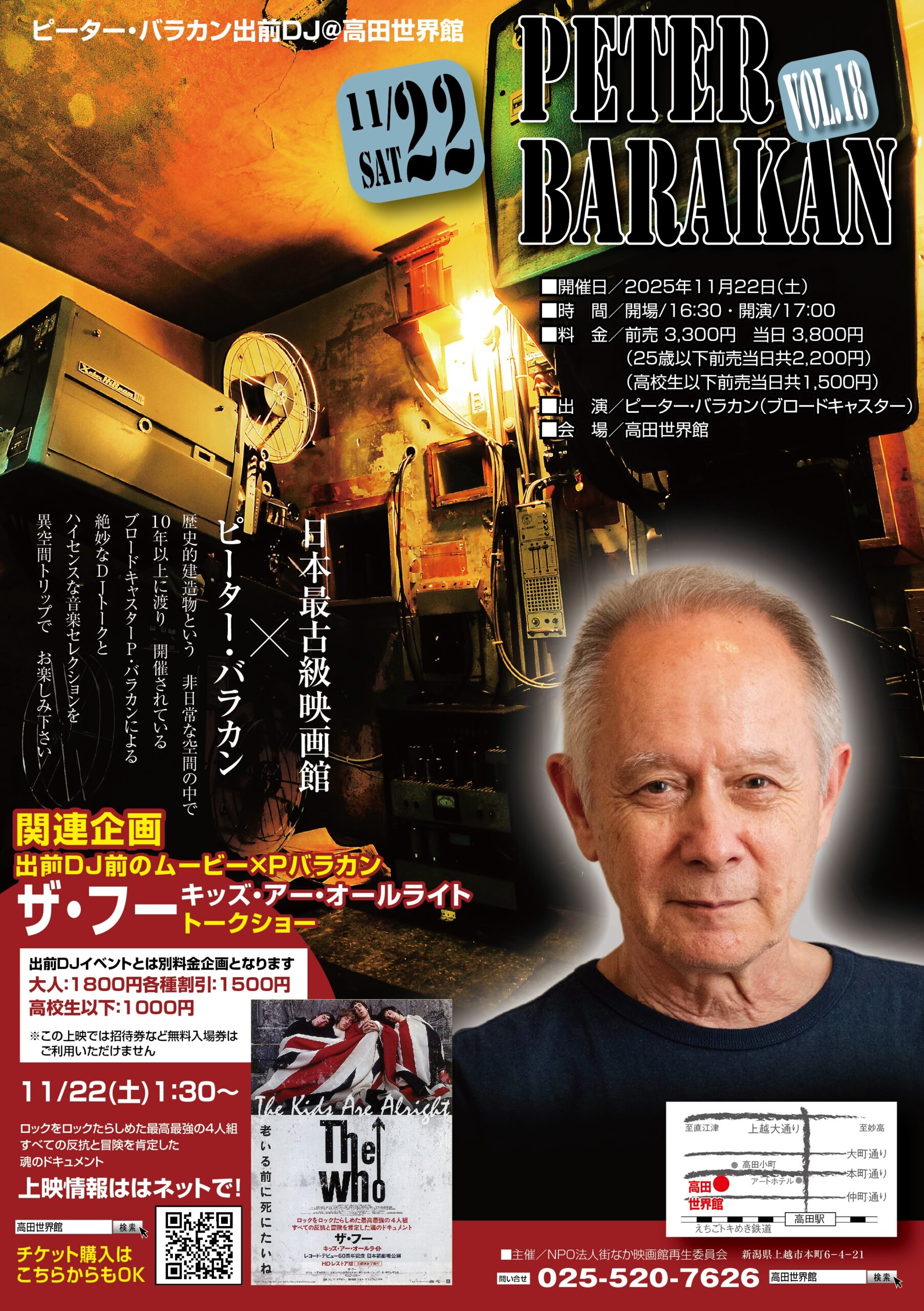 大人気の高田世界館恒例イベント!!迫力の音響セットで聴くピーター・バラカン氏厳選のライブ選曲と軽妙かつ濃厚な音楽談義! 映画館にライブ用の音響セットを組み、ピーターさんのナビゲートのもとで大迫力の音楽が楽しめることで…